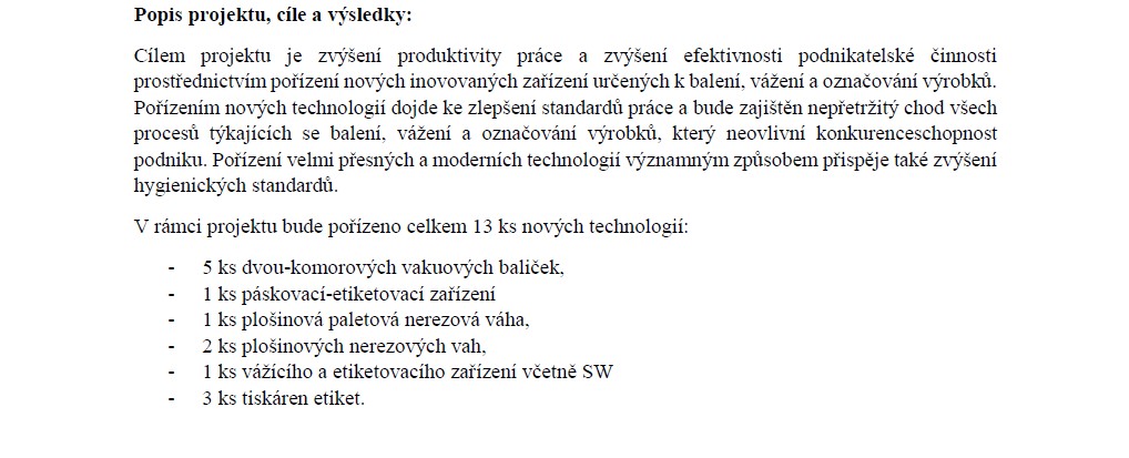 Převažující cíl projektu: Investice, modernizace a inovace zpracovatelských kapacit